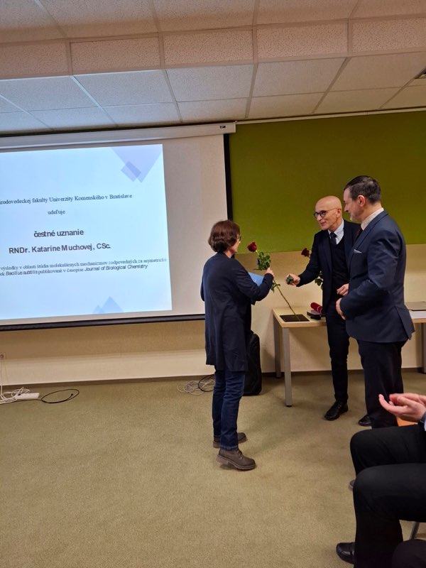 Z ďalších veľmi kvalitných nominácií komisia ocenila čestným uznaním RNDr. Katarínu Muchovú, CSc. (Ústav molekulárnej biológie Slovenskej akadémie vied) za prácu popisujúci molekulárny mechanizmus zodpovedný za asymetrické delenie buniek baktérií Bacillus subtilis (Muchová a kol., 2024).